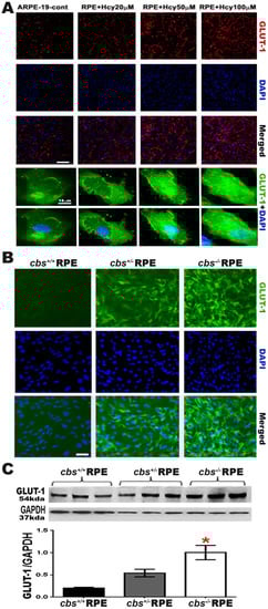 GLUT1 is the primary glucose transporter that enables glucose transport across outer the BRB formed by the RPE [19]. It is expressed mainly and at a high level in the apical and basolateral membranes of the RPE of the outer BRB and in the luminal and abluminal membranes of the endothelial cells of the inner BRB [20,32]. To study the effect of Hcy on GLUT1 activation, the GLUT1 expression was evaluated in primary RPE cells isolated from a mouse model of HHcy (wild-type cbs+/+, cbs+/− and cbs−/− mice, representing the normal level of Hcy, mild/moderate HHcy, and sever HHcy). Immunofluorescence staining of retinal frozen sections for GLUT1 showed increased GLUT1 expression by Hcy in ARPE cells in a dose-dependent manner (Figure 2A, upper part red, low magnification and lower part, green, high magnification). Similarly, GLUT1 expression was increased in the cbs+/− and cbs−/− RPE cells (Figure 2B, green), and this up-regulation of GLUT1 expression is associated with more prominent Hcy in the cbs−/− mice Up-regulation of GLUT1 expression by HHcy was further confirmed by western blot analysis in the primary RPE cells (Figure 2C). GLUT1 expression was significantly increased in cbs−/− mice. Scale bar: 50 μm. * p < 0.05.