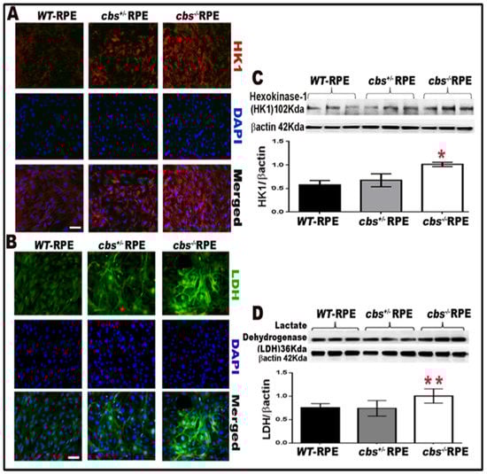 To further study the activation of glycolysis in the RPE by Hcy, we evaluated the enzymes involved in glycolysis’s initial step (HKI-1) and last steps (LDH). Hexokinase and L-lactate dehydrogenase enzymes were evaluated in primary RPE cells isolated from wild-type cbs+/+, cbs+/−,, and cbs−/− mice, as evaluated by immunofluorescence (Figure 3A,B) and western blot analysis (Figure 3C,D). HKI-1 and LDH levels were significantly increased in both the cbs+/− (represent mild/moderate HHcy) and cbs−/− mice RPE cells (represent severe HHcy); this was evident in immunofluorescence staining and western blot analysis compared to wild-type cbs+/+ retinas. These data confirm the activation of glycolysis by elevated Hcy. Scale bar: 50 μm. * p < 0.05, ** p < 0.01.