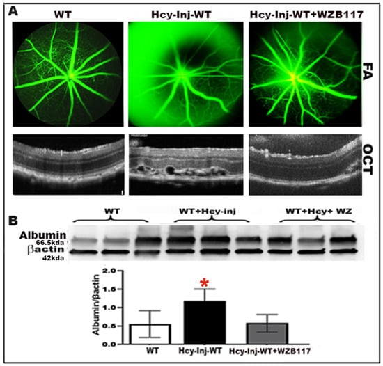 We wanted to examine whether GLUT1 inhibition will rescue the retina from Hcy-induced blood–retinal barrier (BRB) disruption and CNV induction. A functional in vivo study was conducted, using Fluorescein angiography (FA) and optical coherence tomography (OCT) examination in living mice. FA and OCT were used to evaluate vascular leakage, retinal morphology, and CNV induction in living mice. Three groups of mice were used for this purpose at age ~6–8 weeks old (6 mice/group). Mice were subjected to FA and OCT evaluation (wild-type (C57-BL6)) injected intraperitoneal with specific GLUT1 inhibitor WZB117 (10 mg/kg) [36] (to exclude any toxic effect of WZB117, it was injected IP without Hcy-injection followed by evaluation of retinal structure and function) compared to wild-type mice injected intravitreally with Hcy (200 μM) in the presence/absence intraperitoneal of WZB117 (IP, twice in two days before Hcy intravitreal injection). The OCT and FA evaluations were performed 72 h after intravitreal injection of Hcy. FA examination (Figure 4A, upper panel) showed increased fluorescein leakage and disrupted retinal morphology in Hcy-injected wild-type mice compared to wild-type control mice, suggesting decreased integrity of retinal blood vessels and BRB impairment by Hcy, and confirming our previous publications [9,11,16,17,37]. While OCT evaluation (Figure 4A, lower panel) showed normal retinal appearance in wild-type mice but evident disruption at the RPE layer and CNV induction in the retinas of Hcy-injected wild-type mice. Blocking GLUT1 by WZB117 markedly improved retinal structure and CNV induction after Hcy injection, and vascular leakage was further confirmed by determining the albumin leakage in the retinas using western blot analysis following perfusion with PBS solution and as previously described in our publications [9,11,16,17,37]. Western blot data analysis and quantification showed a significant increase in albumin leakage in Hcy-injected mice retina compared to the non-injected mice retina, and the leakage was decreased by WZB117 (Figure 4B), suggesting that blocking GLUT1 could rescue RPE cells, restore the BRB, prevent retinal leakage induced by HHcy, and reduce CNV induction.