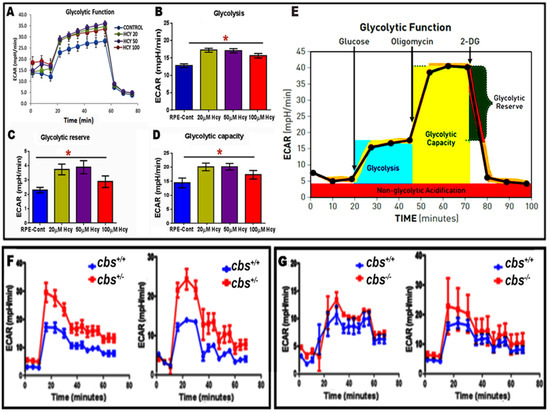 Seahorse analysis evaluation of glycolysis under HHcy. (A) ECAR was measured with an XFe96 extracellular flux analyzer in ARPE cells treated with different concentrations of Hcy (20, 50, and 100 μM), showing that ECAR was significantly elevated in Hcy-treated ARPE cells compared to control untreated cells. (B) ECAR representative analysis showing significant elevation of glycolysis in Hcy-treated ARPE cells compared to control untreated cells. (C) ECAR glycolytic reserve analysis showing significant elevation of glycolysis reserve in Hcy-treated ARPE cells compared to control untreated cells. (D) ECAR glycolytic capacity analysis showed significant glycolysis capacity elevation in Hcy-treated ARPE cells compared to control untreated cells. (E) Diagram showing the stages of glycolysis as evaluated in RPE cells (A–D) and mice retina (F,G). (F,G) Replicate of ECAR measured with an XFe96 extracellular flux analyzer for retinas isolated from mice model of elevated Hcy (wild-type cbs+/+, cbs+/− and cbs−/−), showing activation of glycolysis parameters in both the cbs+/− and cbs−/− compared to wild-type cbs+/+. * p < 0.05 as compared to RPE-control.