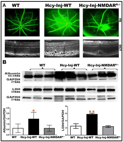 To evaluate the fluorescein leakage and retinal morphology after intravitreal injection of Hcy into wild-type and NMDAR−/−R mice, OCT and FA were performed according to our published methods with some modifications [9,11,16,17,37]. Briefly, the mice were injected intravitreally with Hcy (200 μM) and, after 72 h, OCT and FA were conducted. The mice were subjected to anesthesia using 2% isoflurane and the eye pupils were dilated by 1% tropicamide eye drop. Then, each mouse was placed and imaged on the imaging platform of the Phoenix Micron III retinal imaging microscope supplemented with an OCT imaging device (Phoenix Research Laboratories, Pleasanton, CA, USA). Lubricant gel was added to the eye to keep it moist during imaging. For FA, 10% fluorescein sodium (Apollo Ophthalmic, Newport Beach, CA, USA) was injected into the mice (10 to 20 μL, IP) followed by rapid acquisition of fluorescent images succeeded for ~5 min. Fluorescein leakage establishes as indistinct vascular borders gradually progressing to diffusely hazy green fluorescence.