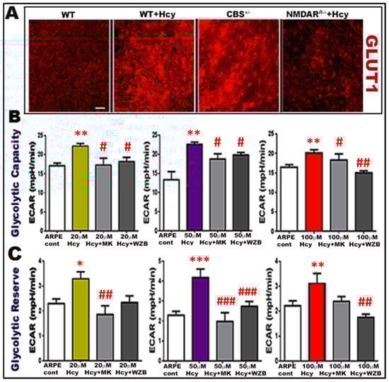 The second set of experiments was conducted after using the same group’s mice and adding the cbs+/− mice group. RPE flat-mounts were isolated from mouse retinas one week after intravitreal injection of Hcy (wild-type and NMDARR−/− mice). RPE flat-mounts were prepared per our published method [9,15,38] and stained with immunofluorescence stain for GLUT1 (red). Mounts show that Hcy injection-induced activation of GLUT1 in RPE cells was more evident in the two mice models of HHcy (cbs+/− mice and mice injected intravitreally with Hcy) compared to wild-type control mice. Deletion of NMDAR in RPE cells (NMDARR −/− mice) mitigated Hcy-induced activation of GLUT1 (Figure 7A). Finally, an in vitro experiment was performed to evaluate glycolysis by seahorse analysis in ARPE-19 cells treated with different concentrations of Hcy (20, 50, and 100 μM) in the presence/absence of NMDAR blocker, MK801(25 μM), or GLUT1 inhibitor WZB117 (10 μM)). Hcy-treatment of RPE cells significantly increased glycolytic capacity and glycolytic reserve in all concentrations, whereas blocking NMDAR or GLUT1 was able to reduce Hcy-induced activation of glycolysis back to normal average level as observed in control untreated ARPE-19 cells (Figure 7B,C). The presented data suggest that HHcy induces AMD features and metabolic shifts in RPE cells and confirms the involvement of NMDAR in this mechanism.