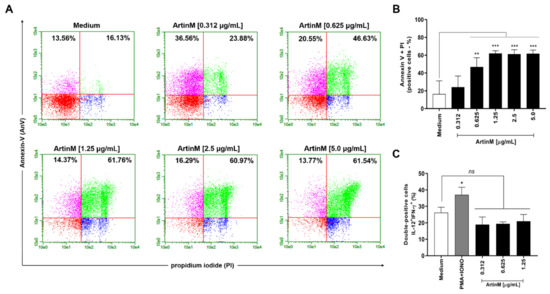 Considering our observation of reduced mitochondrial activity in murine B cells incubated for 24 h with ArtinM at high concentrations (Figure 1A), we examined the occurrence of apoptosis in ArtinM-stimulated B cells. Following 24 h incubation with 0.312–5.0 μg/mL ArtinM, we assayed B cells for annexin V (AnV) and propidium iodide (PI) markers. Compared with unstimulated B cells, B cells incubated with high concentrations of ArtinM showed an increase in AnV and PI (AnV+/PI+) double-positive cells in a dose-dependent manner (Figure 2A,B), indicating that ArtinM induces apoptosis in murine B cells. Then, the immunomodulatory activity of ArtinM at low concentrations in B cells was examined by verifying the relative frequency of IL-12- and IFN-γ-positive cells. Compared to unstimulated cells, stimulation with ArtinM at low concentrations (0.312–1.25 µg/mL) did not increase the frequency of IL-12+/IFN-γ+ double-positive B cells (Figure 2C). These data highlight the ArtinM preference for inducing apoptosis in murine B cells over immunomodulation for Th1 cytokine production.
