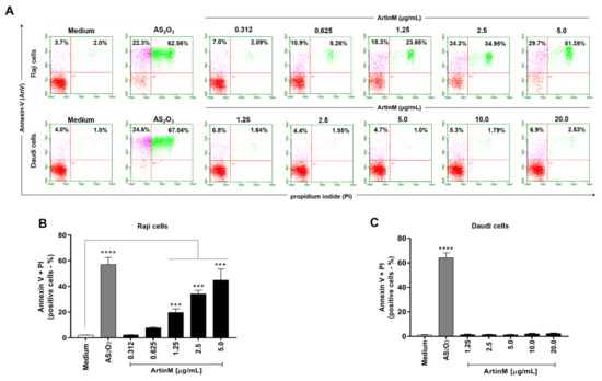 ArtinM induces apoptosis of Raji cells. Raji and Daudi cells (1 × 105 cells/mL) were seeded in 96-well microplates and incubated for 48 h at 37 °C with 0.312 to 5.0 µg/mL and 1.25 to 20.0 µg/mL ArtinM, respectively. Arsenic trioxide (AS2O3) at concentrations of 12 µM (Raji cells) and 24 µM (Daudi cells) was used as a positive control for induction of cell death and medium alone was used as a negative control (Medium). The cells were incubated with annexin V-FITC (5.0 μg/mL) and propidium iodide (10.0 μg/mL), and the frequency of double-labeled (AnV+/PI+) Raji (A,B) and Daudi (C) cells was determined by flow cytometry. Values were expressed as mean ± standard error of the mean (SEM). Significant differences compared to the medium are shown by ***, p < 0.001 and ****, p < 0.0001.