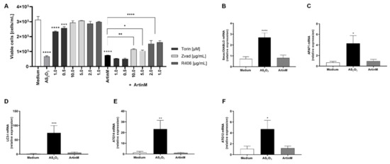 Apoptosis of ArtinM-stimulated Raji cells involves Syk and caspase molecules. Raji or Daudi cells (1 × 105 cells/mL) were seeded in 96-well microplates and stimulated with ArtinM at concentrations of 1.25 µg/mL (Raji cells) or 20.0 µg/mL (Daudi cells) for 24 or 48 h at 37 °C. Arsenic trioxide (AS2O3), at concentrations of 12 µM (Raji cells) and 24 µM (Daudi cells), was used as a positive control of cell death induction; culture medium alone (Medium) was a negative control. (A) Pharmacological inhibitors Z-VAD (10 µg/mL), Torin-1 (1 µM), and R406 (1 µg/mL) were added to the culture, and after 210 min the ArtinM lectin (1.25 µg/mL) was incubated with Raji cells. After 24 h, the cells were harvested and stained with PI to determine the concentration of viable cells of Raji. (B–F) The relative expression of Smac/DIABLO (B), APAF1 (C), LC3-I (D), ATG14 (E), and ATG12 (F) was measured by qRT-PCR in ArtinM-stimulated Raji cells for 48 h. The Ct values of the target transcripts were normalized to the relative expression of β-actin as an endogenous control. The results are expressed as mean ± SEM, and the differences were considered significant at p < 0.05 (*), p < 0.001 (**), p < 0.001 (***), or p < 0.0001 (****).