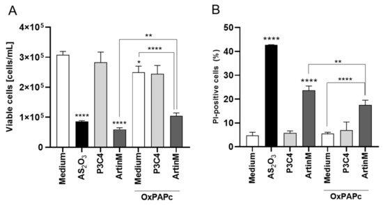 TLR-2 signaling blockaged by OxPAPC reduced the Raji cells apoptosis induced by ArtinM. Raji cells (1 × 105 cells/mL), seeded in 96-well microplates, were incubated with OxPAPC (30 µg/mL) and ArtinM (1.25 µg/mL) at the same time. After 24 h, propidium iodide (10 μg/mL) was added to the cell culture and its incorporation was detected by flow cytometry, allowing the quantification of viable and non-viable cells. Raji cells were incubated with only medium, OxPAPC, or ArtinM as control. Additionally, Raji cells were also incubated with OxPAPC (30 µg/mL) and Pam3Csk4 (1.25 µg/mL) at the same time, and as control the cells were incubated with only Pam3Csk4 (1.25 µg/mL). Arsenic trioxide (AS2O3) at 12 µM was used as a positive control. Based on the total cell number and the frequency of PI+ cells (dead cells, black bars) measured by flow cytometry, the concentration of viable cells (A) and frequency of PI+ cells (B) were determined. The results are expressed as mean ± standard error of the mean (SEM) of three independent experiments carried out in triplicate. Significant differences compared to the medium or the ArtinM alone are shown by *, p < 0.05; ** p < 0.01; ****, p < 0.0001.