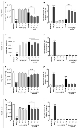 Pharmacological inhibitors of CD45 phosphatase activity and protein tyrosine kinases of the SCR family modify the cytotoxic effect of ArtinM in Raji cells. Raji (A,B,E,F) and Daudi (C,D,G,H) cells (1 × 105 cells/mL), seeded in 96-well microplates, were pre-treated or not with the pharmacological inhibitors NQ-301 (A–D) or dasatinib (E–H) at different concentrations (0.5 to 0.1 µM) for 210 min, followed by stimulation with 1.25 µg/mL ArtinM (Raji cells) or 20 µg/mL ArtinM (Daudi cells). Arsenic trioxide (AS2O3) at 12 µM was used in Raji cells, and at 24 µM in Daudi cells, as a positive control. The unstimulated cells were used as a negative control. After 24 h, propidium iodide (10 μg/mL) was added to the cell culture and its incorporation was detected by flow cytometry, allowing the quantification of viable and non-viable cells. Based on the total cell number and the frequency of PI+ cells (dead cells, black bars), the quantification of viable cells (white bars) was determined. The results are expressed as mean ± standard error of the mean (SEM) of three independent experiments carried out in triplicates. Significant differences compared to the negative control (Medium) are shown by #, p < 0.05; ###, p < 0.001; ####, p < 0.0001. Significant differences compared to the ArtinM alone are shown by *, p < 0.05; ***, p < 0.001; ****, p < 0.0001.