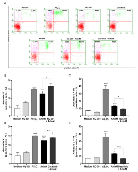 NQ-301 and dasatinib differently affect apoptosis of ArtinM-stimulated Raji cells. Raji cells (1 × 105 cells/mL) were seeded in 96-well microplates and pre-treated or not with the pharmacological inhibitors NQ-301 (A–C) or dasatinib (A–E) at a concentration of 0.2 µM for 210 min. The cells were stimulated with ArtinM (1.25 µg/mL). Arsenic trioxide (AS2O3; 12 µM) was used as a positive control of cell death, and medium alone as a negative control. After 24 h stimulation, the cells were incubated with AnV-FITC (5.0 μg/mL) and PI (10.0 μg/mL) and analyzed by flow cytometry to determine the relative frequency (%) of Raji cells labeled only with annexin V (AnV+) (B,D) or double-labeled annexin V-FITC plus PI (AnV+/PI+) (C,E). Significant differences compared to the medium or the isolated stimulus with ArtinM are shown by *, p < 0.05; ****, p < 0.0001.