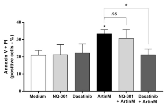 To evaluate the effect of NQ-301 and dasatinib on ArtinM-stimulated apoptosis in normal B cells, they were purified from a suspension of mouse spleen cells. We treated the B cells with NQ-301 (0.1 μM) or dasatinib (0.1 μM), followed by stimulation with ArtinM (1.25 μg/mL). Pre-treatments only did not induce an apoptotic response in B cells, and ArtinM stimulus increased the frequency of AnV+/PI+ cells as expected. We detected a higher frequency of AnV+/PI+ cells in ArtinM-stimulated B cells pretreated with NQ-301, but not in dasatinib-treated cells (Figure 10). Therefore, Src family protein kinases, and not CD45, participate in ArtinM-induced apoptosis of murine B cells.