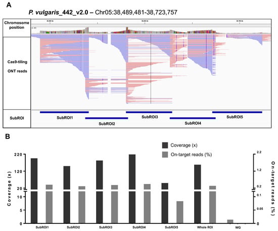 CRISPR RNAs (crRNAs) were manually designed by selecting crRNA target regions in the reference genome (P. vulgaris_442_v2.0) that were annotated with genes and well covered by Illumina WGS reads from the Midas cultivar. All possible candidate crRNAs were designed on the selected regions using the Custom Alt-R CRISPR-Cas9 guide RNA online tool from Integrated DNA Technologies (IDT, Coralville, IA, USA) [41] and by checking the “other species” option. To verify off-targets, candidate gRNAs were aligned to the reference genome using BLAST, and crRNAs with only one target were retained. Illumina WGS reads from the Midas cultivar were also used to further select crRNAs that did not overlap with SNVs or indels. Based on these criteria, we designed 10 crRNAs to enrich sub-ROIs with an average length of 49.8 kbp, resulting in five sub-ROIs with overlaps of ~2–3 kbp that covered the ROI. The crRNAs were synthesized at the 2 nmol scale by IDT (Table 1).