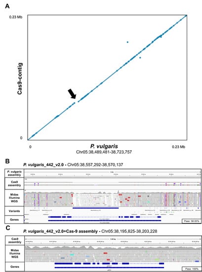 The pod-shattering region features multiple variations and a large deletion of 3 kbp overlapping a gene, when comparing the Midas cultivar and P. vulgaris reference genome. (A) The contig assembly based on Midas Cas9 tiling data (y-axis) was aligned to the pod-shattering region of the P. vulgaris reference genome (x-axis) using NUCmer. Alignments longer than 1 kbp were subsequently filtered and visualized with Dot viewer. Aligned dots highlight regions where the two sequences diverge, and the arrow shows a ~3-kbp deletion in Midas (magnified in panels (B,C)). (B) Integrative Genome Browser Visualization (IGV) of Cas9 assembly and Midas Illumina WGS reads aligned to the P. vulgaris reference genome (Chr05:38,557,292–38,570,137) revealing the detailed tracks of SNVs and SVs identified in the Cas9 assembly compared to the reference genome and the annotated gene overlapping the deletion marked in panel (A). (C) IGV of Midas Illumina WGS reads aligned to the Cas9 assembly (Chr05:38,195,825–38,203,228) in the region including the orthologous gene shown in panel B. Internal boxes show the genotypability (% PASS at ≥5 reads) of the two orthologous genes.