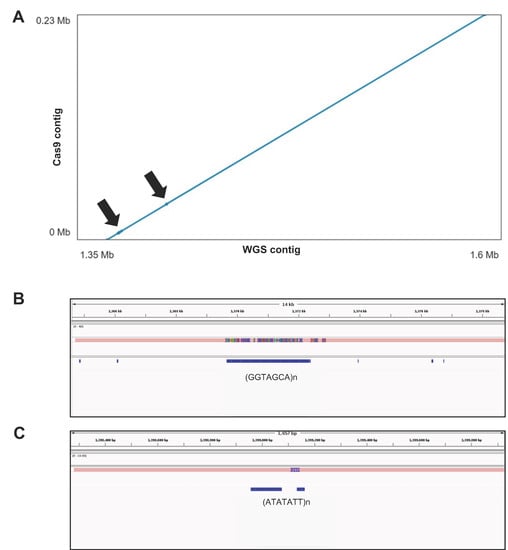 The accuracy of the ROI assembly generated by Cas9 tiling was confirmed by traditional whole genome de novo assembly in parallel (Figure S1A). ONT-based WGS of the Midas cultivar produced 992,031 PASS reads (78% of the total) with an N50 value of 43 kbp, corresponding to an equivalent average coverage of 58× (Table 2). The corresponding de novo assembly generated a genome of 509.2 Mbp comprising 1913 contigs with an N50 value of 3.4 Mb, which was polished using Midas Illumina WGS data. The size of the contig containing the ROI was 3.7 Mbp (Table 3) and showed very high structural and sequence concordance with the region reconstructed by Cas9 tiling (Figure 5A). The two sequences showed 99.5% alignment identity and featured only two regions (2.7 kbp and 300 bp, respectively) with multiple differences (Figure 5A). Manual inspection revealed the presence of low-complexity and homopolymeric stretches in these regions, which are known to generate errors during ONT sequencing (Figure 5B,C).