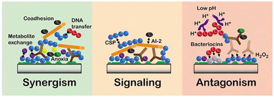 Main interspecies interactions entertained by oral microorganisms for the formation of oral biofilms. Those interactions can be categorized into synergism, signaling, or antagonism. Synergistic interactions are supported by the co-adhesion of microorganisms to other microbes, which enhances multi-species biofilm formation, promotes metabolite exchange, and modifies gene expression through DNA transferring processes, including bacterial conjugation, transformation, and transduction. Signaling interactions are primarily based on Autoinducer-2 (AI-2) and the competence-stimulating peptide (CSP) quorum sensing systems, which influence several aspects of microorganisms’ behavior, including their growth, pathogenicity, and autolysis. Antagonistic interactions rely on: bacteriocins, or hydrogen peroxide (H2O2) production and mechanism lowering microenvironment pH in order to inhibit the growth of specific microbes and gain a competitive advantage. Reproduced with permission. Radaic et al. [22] under Creative Common License.