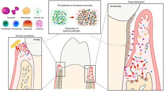 Periodontal tissue in a healthy state and the pathogenesis of chronic periodontitis (CP). In a healthy state, there is a balance between microbial changes and host immune response, with infiltrating neutrophils and resident immune cells in the gingival sulcus, performing immune surveillance. Colonization of periodontal keystone pathogens over-activates the host immune response, leading to the amplification of the proinflammatory cytokine cascade. The first wave of cytokine production is caused by the interaction of the microbiota with all host cells (1), and it primarily contributes to the amplifying of the proinflammatory cytokine cascade and the recruitment, activation, and differentiation of certain immune cells. After being stimulated by the microbiota, mononuclear phagocytes and antigen-presenting cells release a series of cytokines (2) that are intimately linked to the differentiation of a certain subgroup of lymphocytes. Each of these cell subsets secretes a specific pattern of cytokines, which may function as a direct effector or a positive-feedback factor (3) and ultimately result in potential tissue destruction. Reproduced with permission from Pan et al. [69] under Creative Common License.