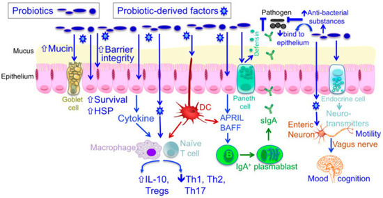 Figure 3. Cellular and molecular probiotics actions. Probiotics guaranteed the preservation of barrier structure and function and the blockade of apoptosis in intestinal epithelial cells through mucus production, survival, and cytoprotective responses. Some probiotic-derived factors, such as polysaccharide A (PSA), modulate the host immune responses through the toll-like receptors (TLR)-2 in dendritic cells (DC), resulting in increased regulatory T cells and interleukin 10 (IL-10) production as well as the downregulation of T helper cells (Th1, Th2, Th17) activity. p40, a Lactobacillus rhamnosus GG (LGG)-derived soluble protein, upregulates EGF-receptor-dependent production of a proliferation-inducing ligand (APRIL) in intestinal epithelial cells, contributing to increased conversion of B cells in plasmablast and consequently enhanced production of secretory immunoglobulin A (sIgA) in the intestinal tissue. Probiotics participate in gut–brain communication through the activation of the vagal pathway—independently of brain-derived neurotrophic factor production—positively affecting responses to stressful, anxiogenic, and depressive stimuli. Reproduced with permission from Yan et al. [105] under Creative Common License.