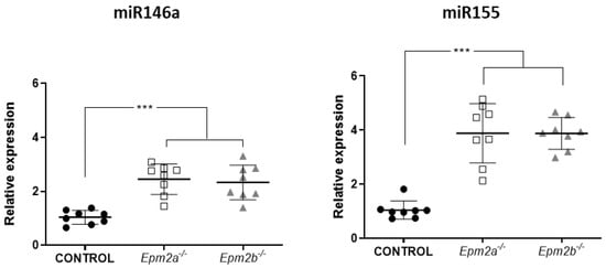 miR-146a and miR-155 are overexpressed in brain extracts from 16-month-old Epm2a−/− and Epm2b−/− mice. Total RNA was extracted from brain homogenates of 16-month-old WT (CONTROL) and LD KO mice (Epm2a−/−, Epm2b−/−), and quantitative real-time PCR analyses were performed using the TaqMan™ probe system. The relative expression of both microRNAs was determined using the comparative 2−ΔΔCT method with the RNU6 gene as an internal reference. *** p < 0.001 when compared to control mice via two-way ANOVA (n = 8).