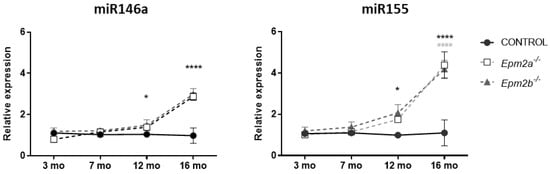 Recent research has highlighted the role of glia in the pathophysiology of the disease, reporting impairment in the regulation of the glutamate transporter in astrocytes from mouse models of LD [9]. We recently provided an exhaustive analysis of the transcriptomic profile in the brains of both Epm2a and Epm2b knockout (KO) mouse models [10], which showed alterations in the expression of genes related to immune response, depicting a neuroinflammatory landscape that is in agreement with the results from other previous studies, in which inflammatory markers were found to be altered in different brain regions [11,12]. Although most of these gene expression alterations could be explained by the misfunctioning/deficiency in laforin and/or malin, little is known about the relationship between specific regulation of gene expression and the laforin–malin complex. Ganesh and collaborators proposed that malin interacted with RNA processing machinery, thus participating in the regulation of microRNA processing [13], but no other work has offered proof that microRNA-mediated signaling could be altered in LD. In the present work, we provide evidence for the overexpression of two microRNA species, namely, miR-146a and miR-155, which are overexpressed in both LD mouse models. Expression of these two microRNAs, which have previously been related to neuroinflammation and epilepsy [14,15,16,17], increases with age, reaching a maximum expression in 16-month-old (mo) mice. The increase in these microRNA levels correlates with an increase in the gene expression of putative target genes and other related genetic regulators directly linked to oxidative stress and inflammatory responses. This study, to our knowledge, is the first to report evidence that microRNAs are altered in the brains of mouse models of LD, and provides interesting pathophysiological clues about the genetic expression alterations registered in these animal models, suggesting that they could potentially be used as future therapeutical targets.