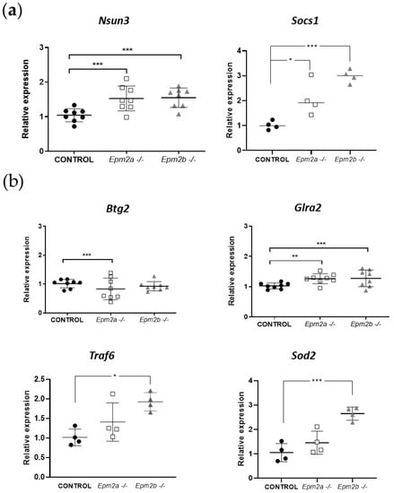We searched for miR-146a and miR-155 targets in miRTarbase (http://mirtarbase.mbc.nctu.edu.tw/); in parallel, we searched for miRNA–target interactions using the TargetScan (http://www.targetscan.org/ (accessed on 30 May 2018)) prediction algorithm, and for targets of the corresponding microRNAs according to an extensive search of the existing literature. From the combined results of these complementary searches, we selected a set of putative target genes to be further validated, as follows: Nsun3 and Socs1 for miR-155; Glra2, Btg2, Traf6, and Sod2 for miR-146a. Surprisingly, not only did we not obtain a significant decrease in the expression levels of these genes (except for Btg2, which was slightly downregulated in Epm2a−/− mice as compared to WT animals), but we registered an increase in the gene expression levels of Nsun3 and Socs1 in both KO mice models (Figure 3a), an increase in Glra2 in both KO mice models, and, finally, an increase in Sod2 and Traf6 only for the Epm2b−/− mice (Figure 3b). Regarding Btg2, only a slight but significant decrease in the expression levels was registered in the Epm2a−/− mice. All the genes analyzed are somehow related to molecular pathways relevant to the pathophysiological context of LD: Nsun3 (NOP2/Sun RNA methyltransferase 3) encodes a mitochondrial methyltransferase related to encephalomyopathy and seizures [18]; Glra2 (glycine receptor alpha 2) encodes for a glycine receptor that has been predicted to influence cognition, learning, and memory in the developing brain [19]; Btg2 (BTG anti-proliferation factor 2) is an anti-proliferative gene that, interestingly, has been postulated as a neuroprotective gene in mouse models of Huntington’s disease [20]; and Traf6 (TNF receptor-associated factor 6) is an immune response regulator with an E3 ubiquitin ligase activity that has been shown to interact with Sod1 in rat models of amyotrophic lateral sclerosis (ALS), promoting aggregation [21].