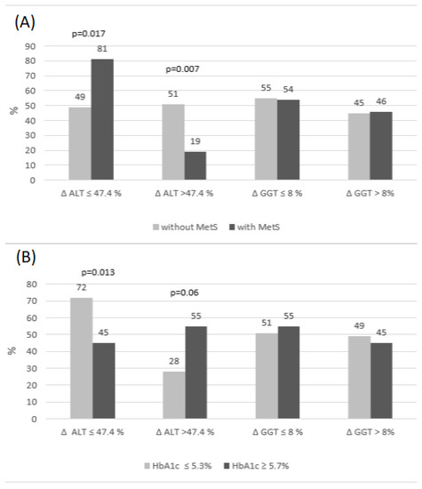 Next, the analysis of deltas for ALT and GGT was performed in subgroups depending on the occurrence of MetS and/or elevated HbA1c and was based on the comparison of RCV (Figure 1). The frequency of deltas above or below the RCV cut-offs was calculated (RCV cut-off for ALT was accepted as 47.4% and RCV cut-off for GGT as 8%). This analysis revealed that the frequencies of GGT delta changes exceeding the RCV cut-off were similar, irrespective of the presence of MetS. It is worth noting that deltas of GGT over the RCV occurred two-fold more frequently in MetS(+) subjects than deltas of ALT (46% vs. 19%). This could suggest that major postprandial GGT, but not ALT, changes may be indicative of metabolic disturbances associated with MetS.