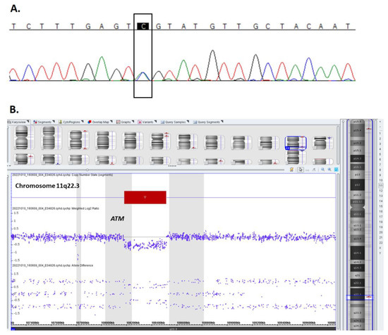 Pathogenic constitutional variants identified in the ATM gene in the proband. (A) Chromatogram displaying heterozygous missense mutation (NM_000051.3):c.434T>G within the ATM gene sequence (characteristic of the pathogenic sequence variant in Table S1). The electropherogram indicates the sequence of the anti-sense strand. (B) Chromosome microarray (CMA) data plot for chromosome 11 showing the germline monoallelic deletion of 11q22.3 encompassing exons 42–66 of the ATM gene. Deviations of probe Log2 ratios below 0 of the SNP probes on chromosome 11q22.3 cytoband indicate interstitial microdeletion identified in the genomic profile of the patient. The coordinates are in GRCh37/hg19.