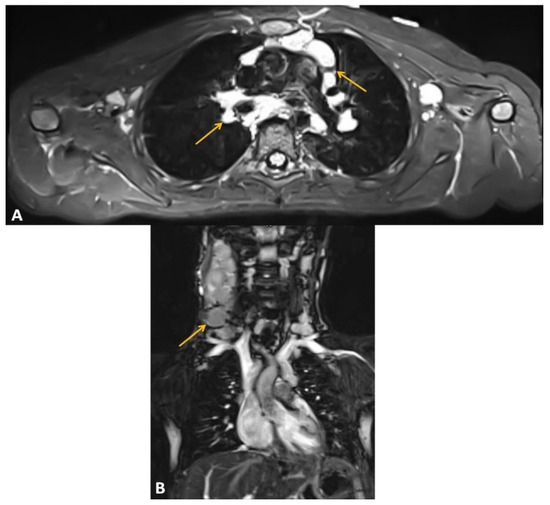 Chest MRI at the moment of LBCL diagnosis with the indication of carotic pathologic lymph nodes masses with arrows. (A) T2 STIR sequence axial. (B) T2 STIR sequence coronal.