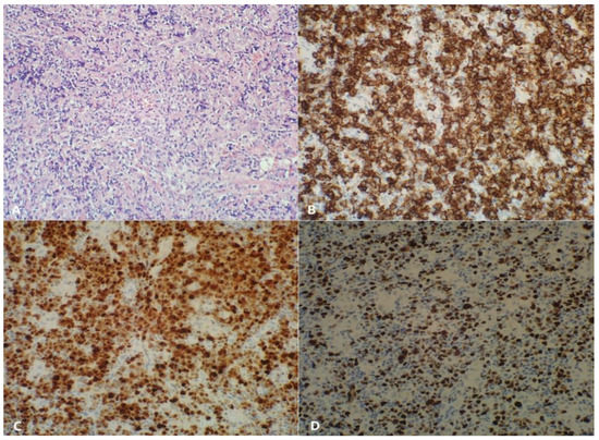 A biopsy of the right carotic lymph nodes was taken (Figure 4A–D). Microscopically, the lesion presented the structure erased by the proliferation of atypical lymphoid cells with the following immunophenotype: CD20 (+), MUM.1 (+), Bcl-6 (+); partially Bcl-2 (+) with CALLA (−), Cyclin 1 (−); CD30 (+) in moderately abundant diffused cells; CD21 (+) in the well-preserved network of dendritic cells; Ki-67 60–70%; EBV (−). Additionally, groups of epithelioid cells and vascular proliferation were seen. Stage III large B-cell lymphoma with IRF4 rearrangement was detected according to the WHO classification revised in 2016 [16].