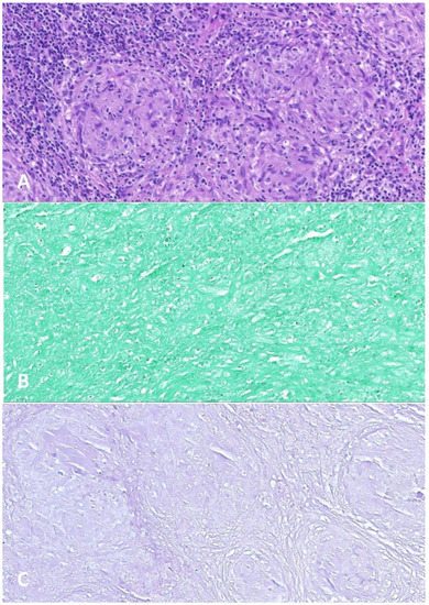 Small lymph nodes excised after Pre-Phase COP, 2 R-COPADM courses, and 1 R-CYM course. (A) Hematoxylin-eosin stain: granulomas (×200). (B) Grocott stain: negative for fungal organisms (×200). (C) Ziehl–Neelsen stain: negative for mycobacteria (×200).