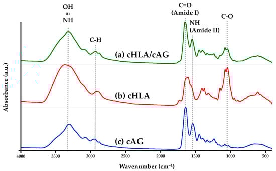 Figure 1 shows FTIR charts of (a) cHLA/cAG, (b) cHLA, and (c) cAG, respectively. It became evident that three samples had similar functional groups of OH or NH at around 3300 cm−1, C-H at 2900 cm−1, and C=O at around 1080 cm−1. Amide peaks (-CO-NH-) were scales used to differentiate the materials examined. cAG had characteristic amide I and amide II peaks at 1650 cm−1 and 1560 cm−1, respectively, both of which cHLA/cAG possessed. cHLA lacked these amide peaks; however, cHLA had a strong C-O peak at 1080 cm−1 which cHLA/cAG also possessed, with cAG having a C-O peak at a minimum level. Overall, cHLA/cAG comprised all the major functional groups of cHLA and cAG.