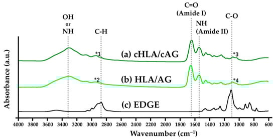 FTIR charts of (a) cHLA/cAG, (b) hyaluronic acid/alkaline gelatin (HLA/AG), and (c) ethylene glycol diglycidyl ether (EDGE). Note: cHLA/cAG was a cross-linked solid, HLA/AG was an uncross-linked liquid, and EDGE was a liquid cross-linker. The symbol * means the selected characteristic peak of FITR charts. The numbers are sequential order of appearance.
