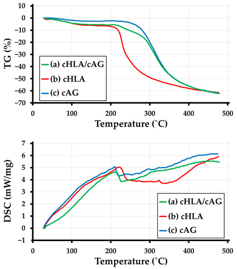 Figure 3 (at the top and bottom) indicates TG and DSC thermal analysis results of (a) cHLA/cAG, (b) cHLA, and (c) cAG, respectively. From the TG curves (Figure 3 top side), the weight loss of cHLA became extensive when the temperature increased to more than 210 °C. The weight drop accompanied by subsequent temperature rise was initially relatively steep and continued up to 480 °C. The weight loss of cAG with incremental temperature increases started from a higher temperature of around 225 °C, and gradually and slowly continued up to 480 °C. The trend of weight decline of cHLA/cAG with increasing temperature was between those of cHLA and cAG, but more closely resembled that of cAG. From DSC curves (Figure 3 bottom), cHLA had a broad endothermic peak between 220 °C and 430 °C while both cAG and cHLA/cAG displayed similar small endothermic peaks between 210 °C and 300 °C. Overall, the thermal properties of cHLA/cAG were judged to be similar to those of cAG and vastly different from those of cHLA.
