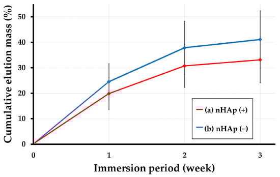 Figure 4 shows the hydrolytic degradation/protein release test results of two constructs including (a) nHAp (+) constructs (i.e., cHLA/cAG/nHAp/bovine serum albumin (BSA)) and (b) nHAp (−) constructs (cHLA/cAG/BSA), expressed by the cumulative elution mass (%) graphs as a function of immersion period (week). It was observed that the protein was released with time from both constructs. The nHAp (−) construct specimens released more protein than the nHAp (+) construct counterparts. It also became apparent that the addition of nHAp suppressed protein release from the nHAp (+) constructs (cHLA/cAG/nHAp/BSA). There was a statistical difference in eluted protein amounts between nHAp (−) and nHAp (+) constructs at any immersion period (p < 0.05, calculated by the Mann–Whitney U test).