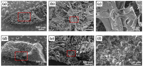 (a) Low-magnified scanning electron microscopy (SEM) image, (b) middle-magnified SEM image of the red square of X1 in (a), (c) high-magnified SEM image of the red square of X2 in (b) of dried cHLA/cAG composite; (d) low-magnified SEM image, (e) middle-magnified SEM image of the red square of X3 in (d), (f) high-magnified SEM image of the red square of X4 in (e) of dried cHLA/cAG/nHAp/BSA construct. Note: nHAp particles were seen on cHLA/cAG porous surface in (d–f).