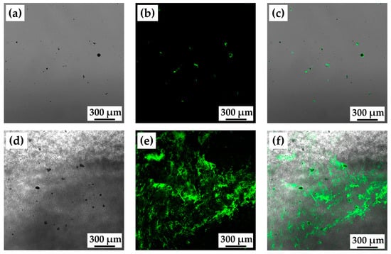(a) The bright field, (b) fluorescence, and (c) overlay confocal laser microscopy images of nHAp mixed with fluorescein isothiocyanate (FITC)-labeled type I collagen; (d) the bright field, (e) fluorescence and (f) overlay confocal laser microscopy images of cHLA/cAG/nHAp/FITC-labeled type I collagen. Note: FITC-labeled type I collagen tended to highly bind to nHAp particles.
