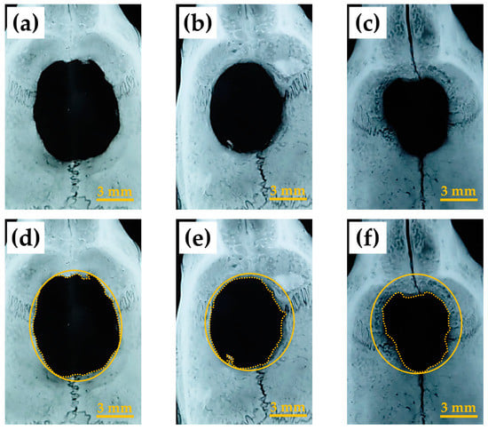 Figure 7 shows representative soft X-ray images of rat cranial bone defects 8 weeks after the operation with and without construct materials including (a) defects only, (b) defects with BMP (−) constructs (i.e., cHLA/cAG/nHAp) and (c) defects with BMP (+) constructs (i.e., cHLA/cAG/nHAp/BMP), respectively. Figure 7d–f indicate the same defects with the addition of dual circles to Figure 7a–c, respectively. The original defect corresponding zone was encircled by a solid line while the edge of the newly extended bone was depicted by a broken line. The difference in the area between zones defined by solid and broken lines was indicative of the area of the newly extended bone. In defect only, the defect deformed to the ellipse with the long diameter in the sagittal direction reaching 8 mm. This was stretched from the original defect length of 6 mm. Bone extension from the original bone defect was noticed on all three samples. However, the implantation of the BMP (+) construct accelerated bone extension the most, followed by the BMP (−) construct, while the defect only produced the least bone extension.