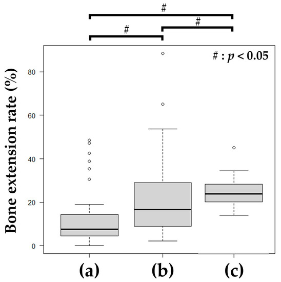 Figure 8 shows a tooled box graph of bone extension rates of (a) defects only, (b) BMP (−) constructs, and (c) BMP (+) constructs. Bone extension rates were determined by length-online measurements (n = 8 for each defect) on soft X-ray images of rat cranial bone defects 8 weeks after the operation, respectively (n = 8 for BMP (+) constructs, n = 6 each for BMP (−) constructs and defects only). Results clarified that BMP (+) constructs extended bone at the rat cranial bone defect the most, followed by BMP (−), while bone defects only extended bone the least. There was a statistical difference between any two combinations of defects only, BMP (−) constructs and BMP (+) constructs (p < 0.05, calculated with the Kruskal–Wallis test).