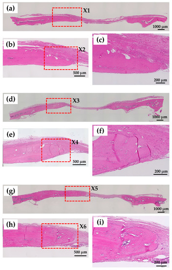 Hematoxylin and Eosin (HE)-stained histological images of rat cranial bone defects 8 weeks after the operation with and without construct materials including (a–c) defect only, (d–f) defect with BMP (−) construct (i.e., cHLA/cAG/nHAp) and (g–i) defect with BMP (+) construct (i.e., cHLA/cAG/nHAp/BMP). (b): enlarged from X1 in (a,). (c): enlarged from X2 in (b). (e): enlarged from X3 in (d). (f): enlarged from X4 in (e). (h): enlarged from X5 in (g). (i): enlarged from X6 in (h).