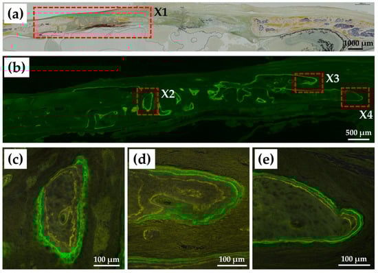 Figure 11a shows a Villanueva-stained image of a rat cranial bone defect 8 weeks after implantation of BMP (+) construct (i.e., cHLA/cAG/nHAp/BMP). It became evident that bone extension from the left side was extensive reaching approximately 2 mm in length. The extended bone consisted of an array of island-like bones. Figure 11b indicates a magnified calcein (CL)-fluorescent image of X1 in Figure 11a. New bone formation was very active in the last week of the 8-week period. Figure 11c–e are magnified tetracycline (TC)/CL-double fluorescent images of X2, X3, and X4 in Figure 11b, respectively. These enlarged images confirmed active bone formation in the last three weeks, with two distinct modes of bone growth from the ossification center (Figure 11c) and bone extension from pre-existing bone (Figure 11d,e).