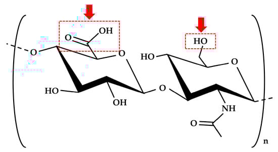 For the production of cHLA liquid, HLA powder (1.25 g) was dissolved into distilled water to form 2.5 wt% sol at 20 °C (Liquid A) (50 mL). The EGDE cross-linker (10 mL) was diluted by three with distilled water (20 mL), and the pH was adjusted to be four with NaOH and HCl solutions using a pH/ion meter (F-24; Horiba, Ltd., Kyoto, Japan) (Liquid B). Liquid A (30 mL) was mixed with the liquid B (10 mL) at a 3-to-1 ratio, followed by chemical cross-linking at 50 °C for 3 h. The liquid mixture was then cooled at 4 °C for 1-h. Figure 12 indicates two major cross-linking points of HLA, including -COOH and -OH functional groups. Figure 13a indicates the schematic of cross-linking reaction of HLA with EGDE using -COOH groups at pH four. The sol mixture was then purified using dialysis (Mw = 12,000–14,000, Code 3-25; Thermo Fisher Scientific, Waltham, MA, USA) against exchanged distilled water (1 L), three times for 3 days. The volume of the cHLA was increased by 3.5-fold relative to that of the original uncross-linked HLA.