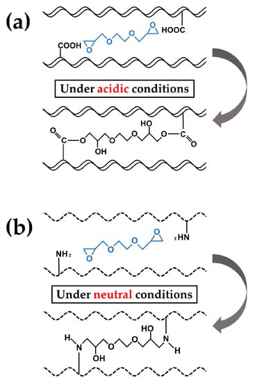 Schematic of cross-linking reactions of (a) HLA with EGDE using -COOH groups at pH = 4, and (b) AG with EGDE using NH2 groups at pH = 7.