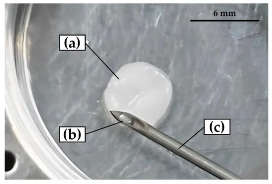 The photo of a cHLA/cAG disk on a 35 mm culture dish after pouring the aliquot with nHAp and BMP using a syringe. Note: (a) wet cHLA/cAG/nHAp/BMP construct, (b) residual aliquot, and (c) syringe used.
