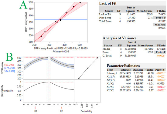 Plot comparing actual vs. predicted values for response (DPPH assay, μM TEAC) (plot A) and desirability function (plot B) for DPPH-optimized radical scavenging activity of tocopherol mixtures. Statistics for evaluation of the model that was developed are provided in the inset tables. Asterisks and colored values indicate statistically significant values.