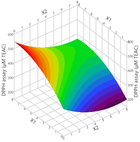 Analyses were conducted in triplicate and the results are presented as means of triplicate determinations. The statistical significance of differences between mean values was assessed by a one-way analysis of variance (ANOVA) test; p < 0.05 was considered statistically significant. The experimental design for the response surface methodology and all associated statistics was accomplished with JMP™ 16.