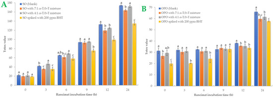 Sunflower oil (plot A) and olive pomace oil (plot B) samples’ Totox values during Rancimat incubation are shown. Standard deviation is shown with error bars, and means with different superscript letters (e.g., a–c) are statistically significantly different (p < 0.05) for the same Rancimat incubation time.