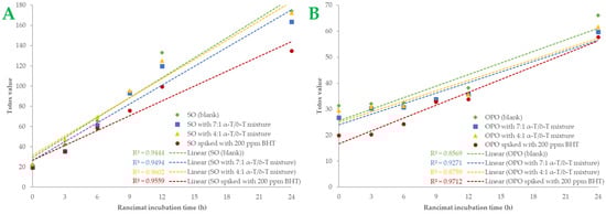 A more comprehensive index of oil oxidation is the total oxidation value, known as “Totox” value, which combines total polar compounds index with p-AV to provide a measurement of both primary and secondary oxidation products [5,35]. Greater oxidative stability is shown by a lower Totox value [36]. Totox value was calculated as the sum of PV value (mmoL H2O2/Κg Oil) plus p-AV (i.e., TV = 2 × PV + p-AV). The results are shown in Figure 3. Totox values in SO samples are higher than in OPO samples. By the end of the accelerated oxidation condition, SO samples had Totox values ranging from 135.03 to 174.29. The 7:1 tocopherol mixture recorded a 6.02% total reduction in oxidation products, while the 4:1 mixture reduced Totox value by 1.07%. In OPO samples, Totox values ranged from 57.75 to 66.08. The 7:1 tocopherol mixture reduced oxidation products by 12.62% and the 4:1 mixture by 6.76%. Statistically significant differences (p < 0.05) were found in BHT-spiked samples. BHT was the most effective antioxidant in both oil samples, especially in SO samples. It is known that OPO is more resistant to the oxidation process due to its MUFA content [29]. Furthermore, it could be presumed that the 7:1 tocopherol mixture is more effective than the 4:1 mixture in both SO and OPO samples. Sun-Waterhouse et al. [37] studied the encapsulation effect combined with a caffeic acid spike in olive oil samples. At 37 °C and after 30 days of storage, a vast reduction of 24.34% in Totox value (with PV expressed as meq/kg oil) was measured in encapsulated and spiked samples. In another investigation [38], variations in Totox values under accelerated conditions were remarkably comparable to those of PV. We also noticed that both oils had a linear correlation with Rancimat incubation time. The correlation coefficient (R2) of Totox value with Rancimat incubation time is shown in Figure 4A,B. Excellent correlation with R2 almost above 0.95 was measured in SO samples, and above 0.85 in OPO samples. Such a high correlation between these variables could be much more useful when it comes to predicting Totox values under specific Rancimat conditions in silico.