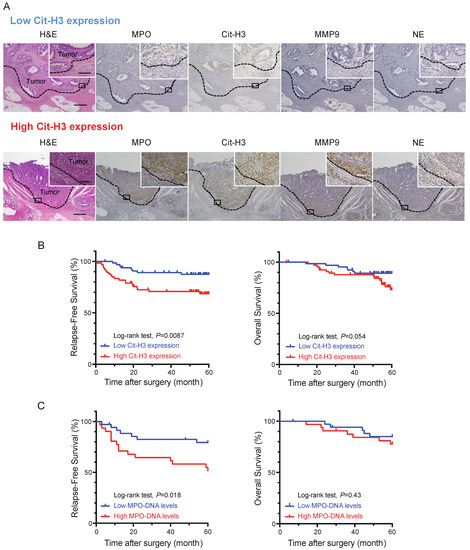 To evaluate the clinical relevance of NETs in CRCs, we examined the expression of neutrophil markers (i.e., MPO, MMP-9 and NE) and a marker of NETs, citrullinated histone H3 (Cit-H3), via the immunohistochemical (IHC) analysis of 133 patients with stage I, II and III CRC who underwent curative resection. Neutrophils infiltrating CRC tissue were detected by staining for MPO, MMP-9 and NE. The expression of Cit-H3 colocalized with the expression of these neutrophil markers, indicating the induction of NETs in CRC tissues (Figure 1A). The patients were divided into two groups according to the expression level of Cit-H3: the high Cit-H3 group (n = 67) and the low Cit-H3 group (n = 66). No significant differences in patient characteristics were observed between the two groups (Supplementary Table S1). We then analyzed overall survival (OS) and RFS and found that the high expression of Cit-H3 was significantly correlated with poor RFS (p = 0.009). In addition, there was a tendency for high Cit-H3 expression to correlate with poor OS, although this was not statistically significant (p = 0.054) (Figure 1B).