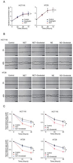 Six well plates were coated with 0.3 mg/mL Cellmatrix Type I-C (Nitta Zelatin, Yaoshi, Japan) and were incubated for 2 h at 37 °C. After incubation, Cellmatrix was removed, and the coated plates were blocked with 0.3% BSA for an hour at 37 °C. After washing the plates with PBS, 5 × 105 HCT116 and HT29 cells per well were plated and incubated for 24 h. The plates were scratched with a 1000 μL pipette tip and were washed with PBS. FBS-free medium (DMEM Ham’s F12; Nacalai Tesque), neutrophil control medium and NET-CM were added to each well. Furthermore, cells were treated with NET-CM, NET-CM + 100 µM sivelestat (17779; Cayman, Ann Arbor, MI, USA), NET-CM + 10 nM MEK inhibitor (PD0325901; Chemscene, Monmouth Junction, NJ, USA), 10 µg/mL NE (ENZO, Farmingdale, NY, USA), 10 µg/mL NE + 100 µM sivelestat and the vehicle control. The doses of reagents were determined according to previous studies [74,75,76]. Wounds were observed with a phase-contrast microscope (BZ-X810; Keyence) to measure the widths of six points in each wound. The averaged value of these six points was used as the width of each wound.