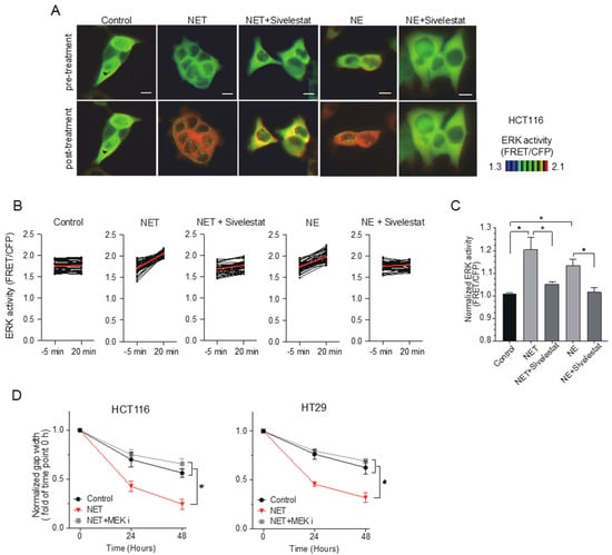 Next, we investigated the molecular mechanisms by which NE activates the migration of CRC cells. Previous studies have reported that ERK is a key regulator of cell migration in various types of cells [34,35]; therefore, we investigated whether accelerated CRC cell migration caused by NET-CM or NE is regulated by ERK. To visualize the ERK activity using time-lapse live imaging [36], we transduced a Förster resonance energy transfer (FRET, Île-de-France, France) biosensor for ERK (pPBbsr2-3560 NES) into HCT116 cells. ERK activity is presented by FRET/CFP ratio images (Supplementary Figure S3 and Supplementary Video S1).