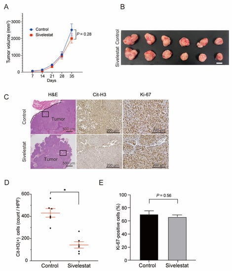 First, to assess the effect of NE on the proliferation of CRC cells in vivo, we transplanted HCT116 cells into the dorsal flanks of 7–8-week-old female KSN/slc nude mice and evaluated the effect of sivelestat treatment on tumor growth. Mice in the control and sivelestat groups were subcutaneously injected with HCT116 cells that were pre-incubated with NET-CM or NET-CM plus sivelestat, respectively. Mice were administered with a daily intraperitoneal injection of the vehicle and sivelestat (10 mg/kg, CAYMAN) from the day before the transplantation of HCT116 cells. No significant change in tumor size was detected between the two groups after five weeks treatment, although the successful suppression of NETs in the sivelestat group was confirmed by the decreased expression of Cit-H3 (Figure 4A–D). As expected, no significant difference was observed in the proportion of Ki67-positive cells in xenografts (Figure 4E). These results support the in vitro finding that NETs have no effect on the proliferation of CRC cells.