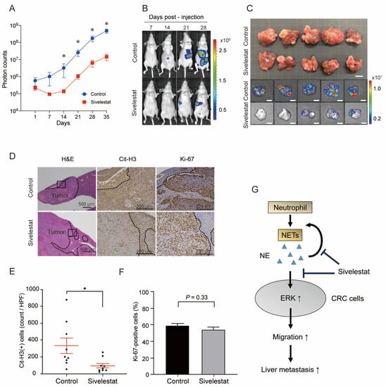 Next, we evaluated the effect of NE on CRC cell metastasis using the experimental liver metastasis model. Luciferase-expressing HCT116 cells (HCT116-Luc) were injected into the spleens of nude mice, which enabled the monitoring and quantification of metastasized tumor cells in the liver with bioluminescence [37,38]. Nude mice were administered with a daily intraperitoneal injection of 10 mg/kg sivelestat or the vehicle from the day before the splenic injection of HCT116-Luc cells. The bioluminescence intensity started to increase soon after the injection of HCT116-Luc cells in the control group, whereas it started to increase two weeks later in the sivelestat group. A significant decrease in bioluminescence intensity was observed in the sivelestat group compared to the control group after two weeks of injection (p < 0.05) (Figure 5A,B). Interestingly, the bioluminescence signal in both groups increased at similar rates after these two weeks (Figure 5A). Mice were sacrificed five weeks later, and the decrease in liver metastases was confirmed macroscopically in the sivelestat group (Figure 5C). IHC analysis revealed the decreased expression of Cit-H3 in liver metastases of sivelestat-treated mice, indicating the successful suppression of NET formation. However, no significant change in the proportion of Ki-67-positive cells was detected between the two groups (Figure 5D–F). These results indicate that the inhibition of NE suppresses the infiltration of tumor cells into liver tissues from the venules, which is the initial step of liver metastasis. This could explain the delay in the increase in bioluminescence in the first two weeks after CRC cell injection. However, once tumor cells extravasate into the liver tissues, NE inhibition does not suppress the proliferation of CRC cells, which was shown by a similar increase in bioluminescence after two weeks of injection. These results indicate that the inhibition of NE by sivelestat could be a potential therapeutic option to suppress the liver metastasis of CRC cells (Figure 5G).