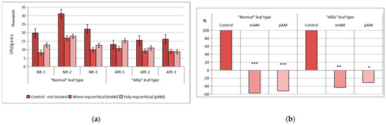 Average population density of the trophic group Micromycetes (CFU g−1 absolutely dry soil) in the rhizosphere communities formed after introduction of AM fungi: (mAM) mono-mycorrhizal and (pAM) poly-mycorrhizal inoculants. (a) Average values for the particular varieties of garden pea with “normal” leaf type (Nlt-1—cvr. Marsi, Nlt-2—cvr. Plovdiv and Nlt-3—cvr. 22/16-n) and “afila” leaf type (Aflt-1—cvr. 22/16-af, Aflt-2—cvr. Kazino and Aflt-3—cvr. Echo). Error bars indicate standard error of the mean (SE). (b) Relative values of the differences in the population levels of the trophic group Micromysetes (%) compared to the untreated controls, including means for both “normal” leaf type and “afila” leaf type genotypes. The significance of the differences between means of controls and treatments were calculated with the two-tailed Student’s t-test (at df—10; *** p < 0.01, ** p < 0.05 and * p < 0.10).